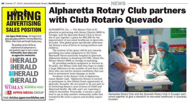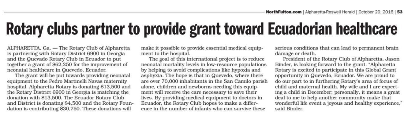 Alpharetta Rotary partnered with six D6900 Clubs, and the Quevado Rotary Club to organized a Global Grant for $62,250 for the improvement of neo-natal healthcare in Ecuador. Partnering Clubs include Columbus, Sandy Springs, Milton, Johns Creek, North Fulton and Marietta Metro. This global grant specifically addresses the Rotary’s area of focus in saving mothers and children.