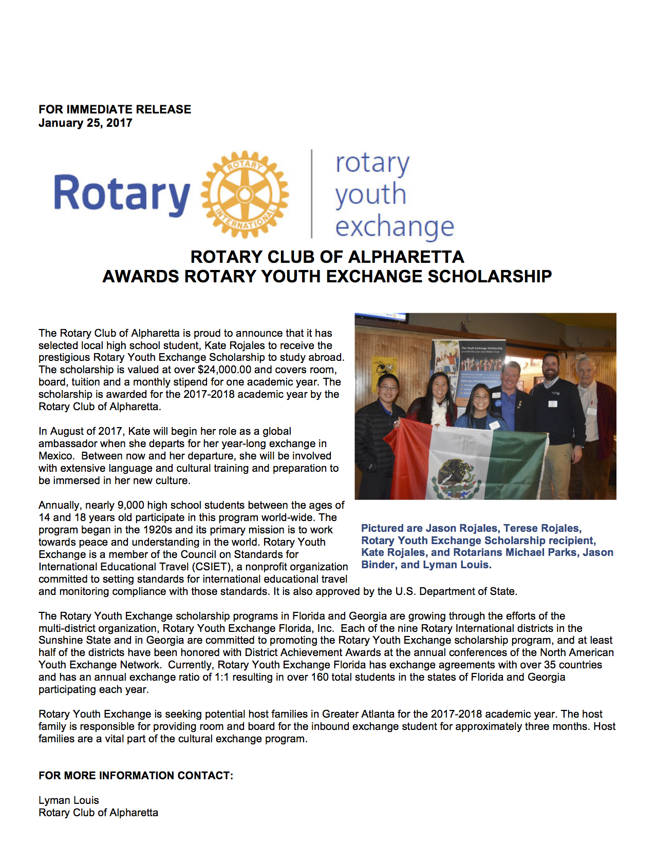 ROTARY CLUB OF ALPHARETTA AWARDS ROTARY YOUTH EXCHANGE SCHOLARSHIP