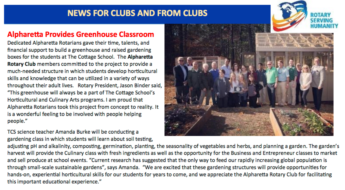 Alpharetta Rotary enjoys sharing our projects and events with other clubs in the district by submitting articles to the District Newsletter. Each month, we share our Rotary Moments to share with the DIstrict.