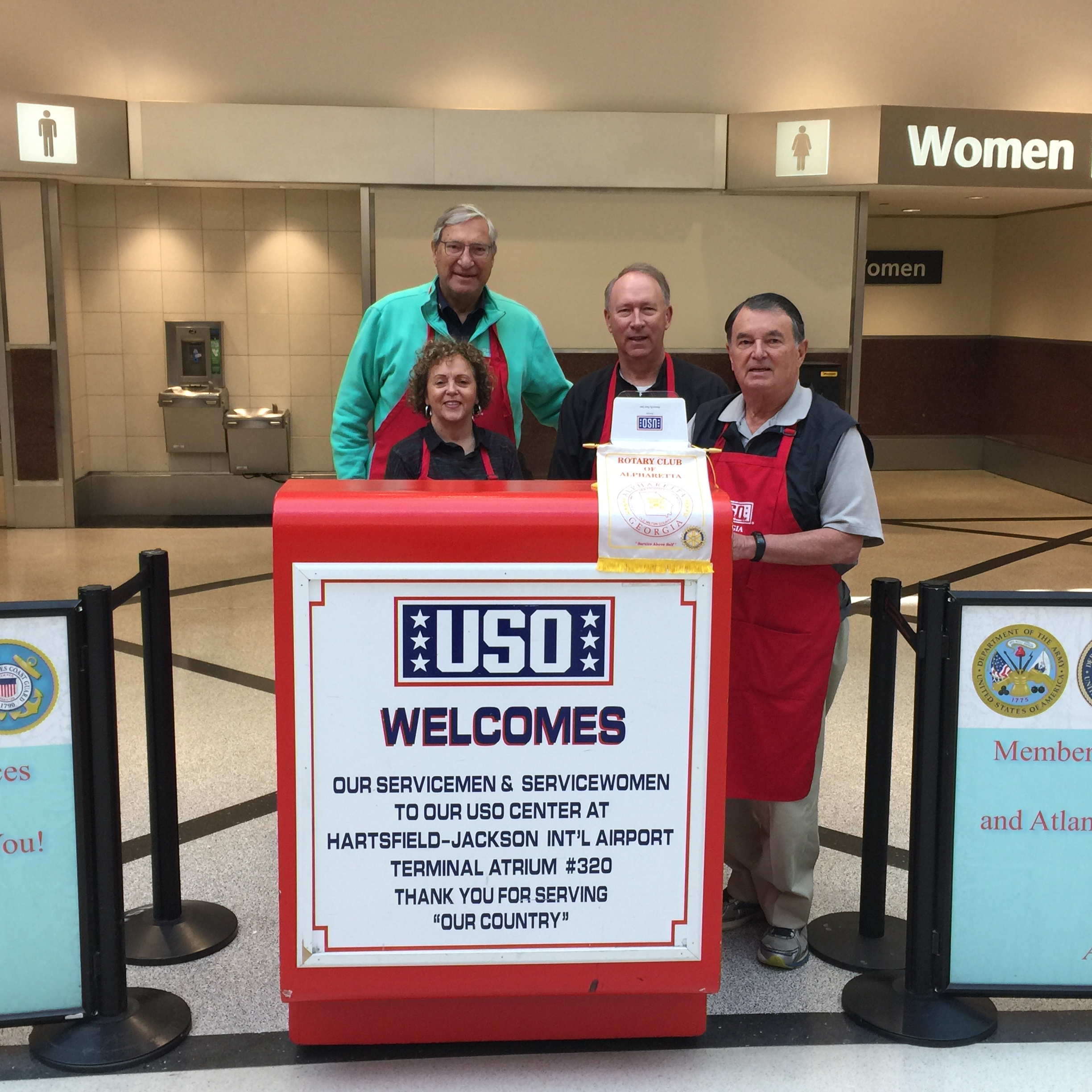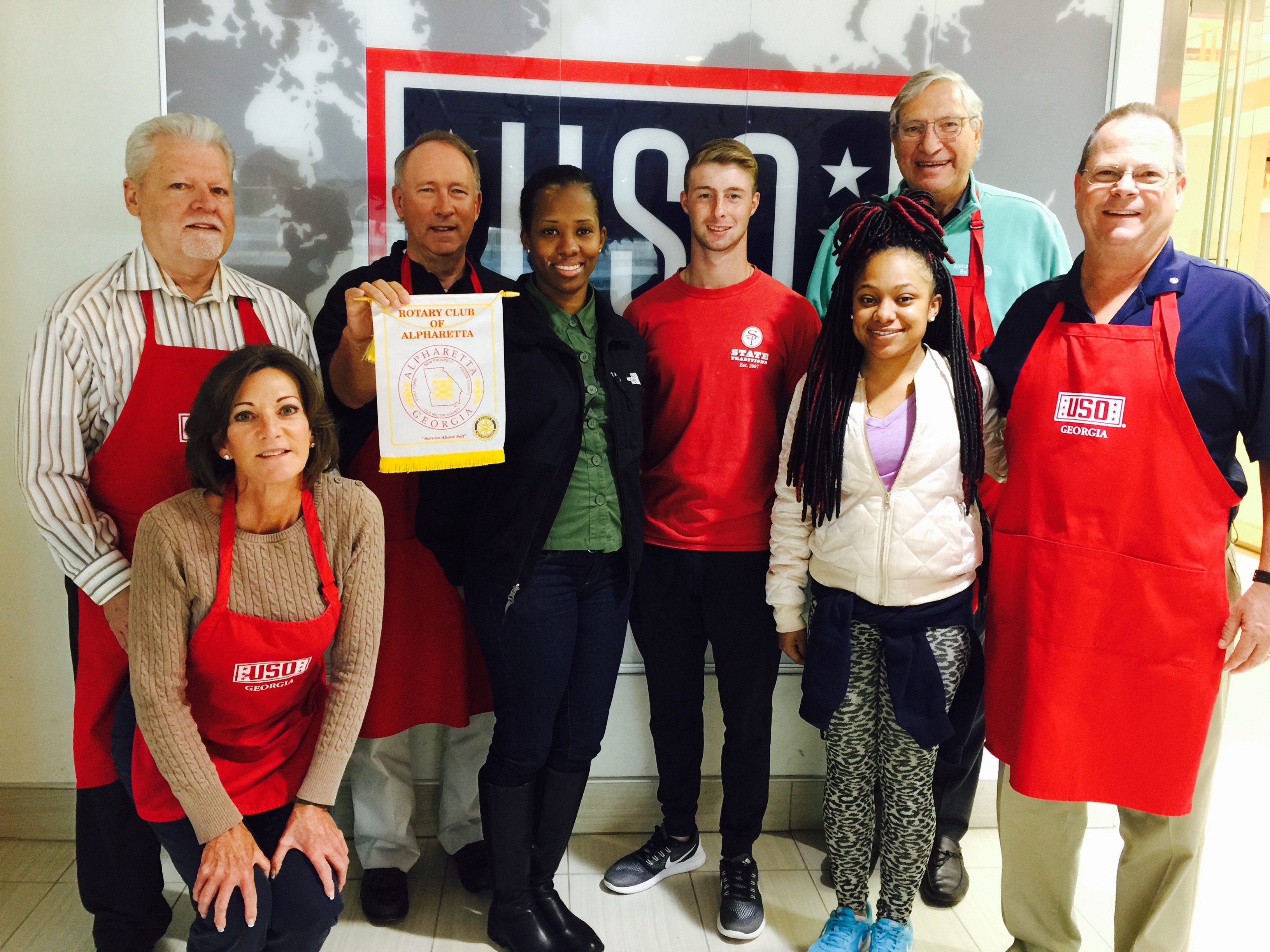 The Rotary Club of Alpharetta has a long history of service to our community. One of the most enduring facets of the club is its unwavering support of the men and women of our military. Each quarter between 6 Alpharetta Rotarians spent the day at the USO serving lunch and assisting service members passing through the airport. A full bar-b-que lunch is served complete with all the trimmings.